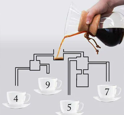Don't spend too much time "brewing" over the solution to this coffee puzzle, but do look at the simple diagram. Coffee is pouring into a set of pipes. Which of the four cups will receive the coffee first?