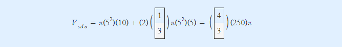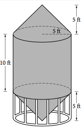 The answer is 4The volume of the grain silo can be found by adding the volumes of all the solids of which it is composed (a cylinder and two cones). The silo is made up of a cylinder (with height 10 feet and base radius 5 feet) and two cones (each with height 5 ft and base radius 5 ft). The formulas given are used to determine the total volume of the silo. Since the two cones have identical dimensions, the total volume of the silo, in cubic feet, is found using the following equation - approximately equal to 1,047.2 cubic feet.