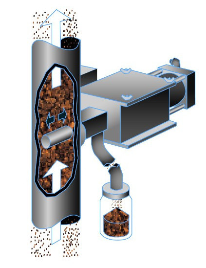 While fully extended, the sample tube rotates 270 degrees, taking a representative sample through the product stream. The sample tube then retracts out of the product stream, into the sampler housing and deposits the sample into the discharge. The sample tube can be driven pneumatically or hydraulically.