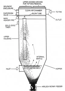 An exhaust fan is designed into the dust collection system to move air from the point of pickup, through the baghouse and filter media, and out the exhaust stack. The fan selected is specific to the application with respect to volume and pressure drop throughout the system.