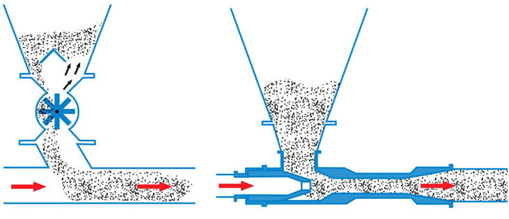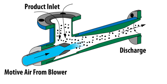 How do they work? Fox Eductors, – also referred to as jet pumps – use low pressure air (below 14 psig or 1 bar) to move powders, pellets, and bulk solids into a pneumatic conveying system with no moving parts. Venturi eductor systems can convey product at up to 15 tons per hour over distances up to 500 feet.